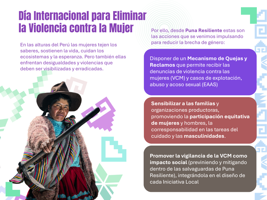 En las punas del Perú, donde las mujeres sostienen la vida con la fuerza de la tierra, esta fecha adquiere mayor importancia para un proyecto como Puna Resiliente, que trabaja por la mejora de la vida de las comunidades altoandinas. Frente a las desigualdades que muchas mujeres enfrentan, como las violencias visibles e invisibles, la sobrecarga del cuidado, la exclusión de los espacios de decisión, entre otros; trabajar en la resiliencia climática implica recuperar la dignidad y seguridad de sus mujeres.